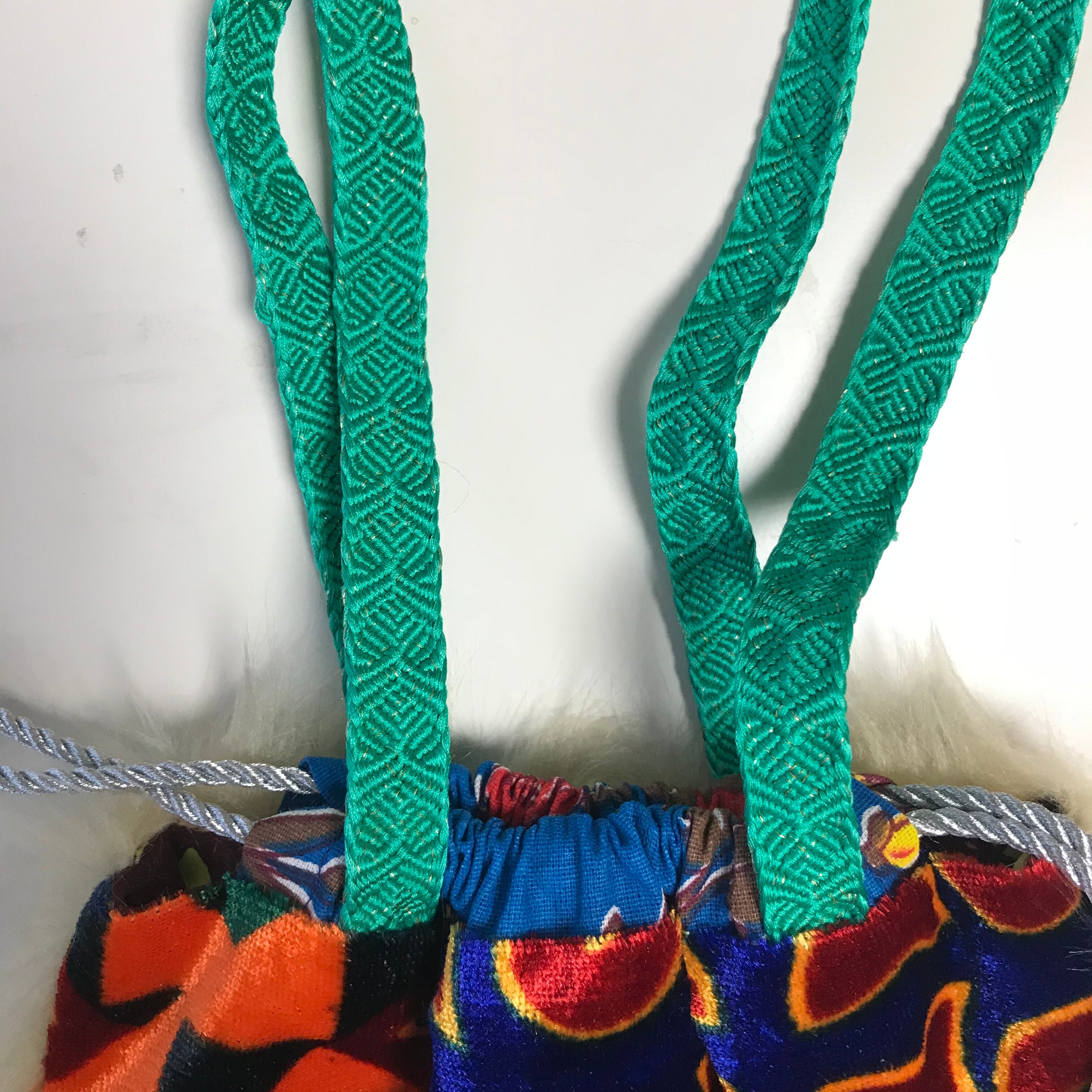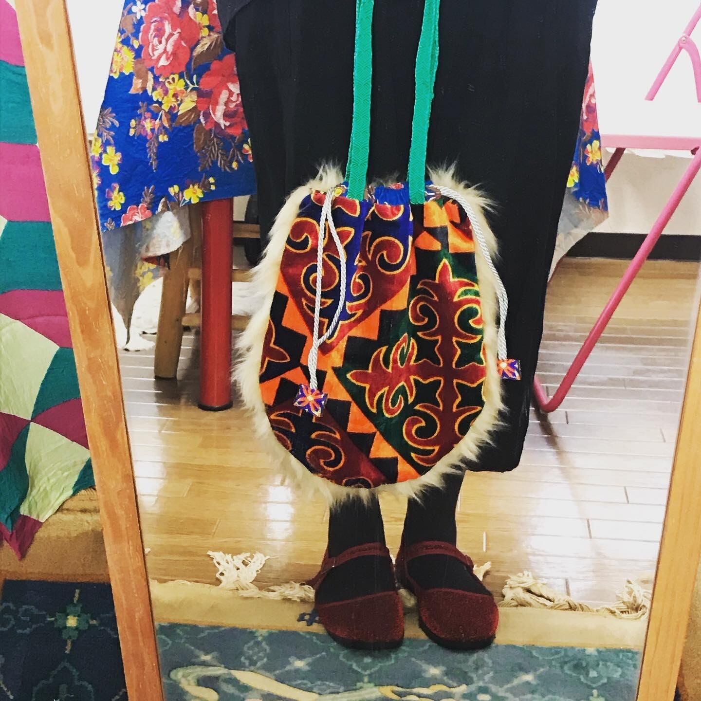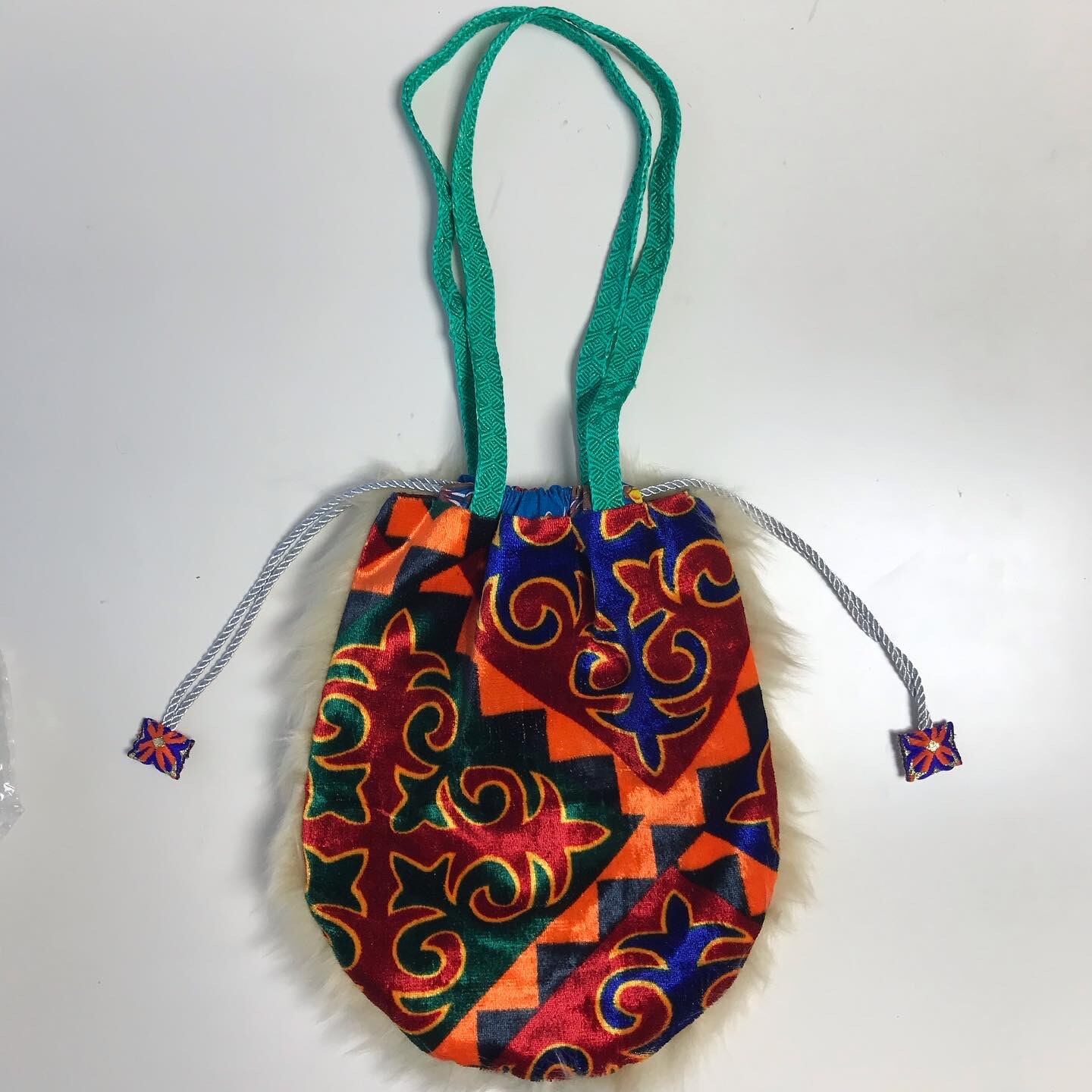 カシュガルで見つけたキルギス模様のベルベット風の生地と、獣のようなファーを合わせたファンキー巾着トートです。