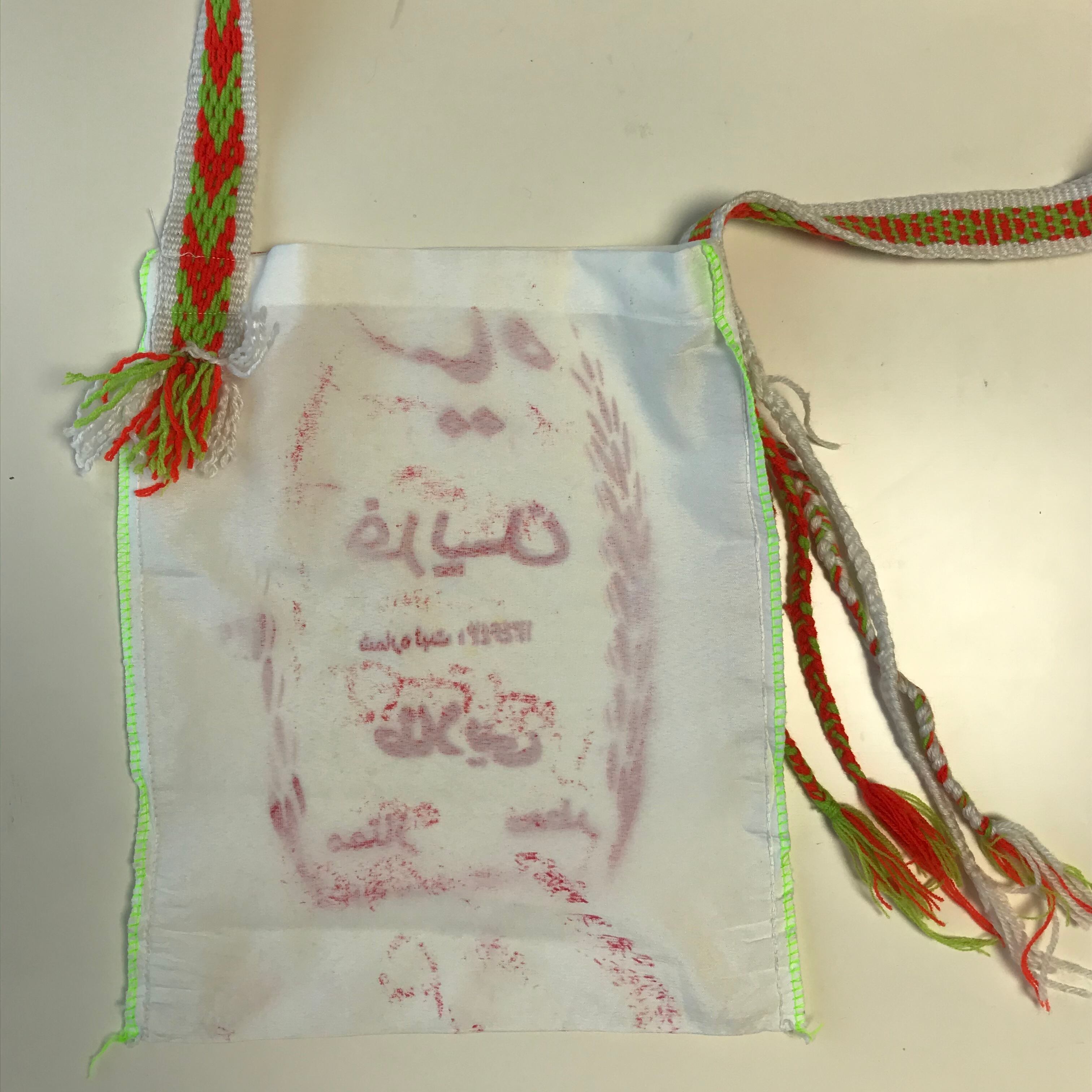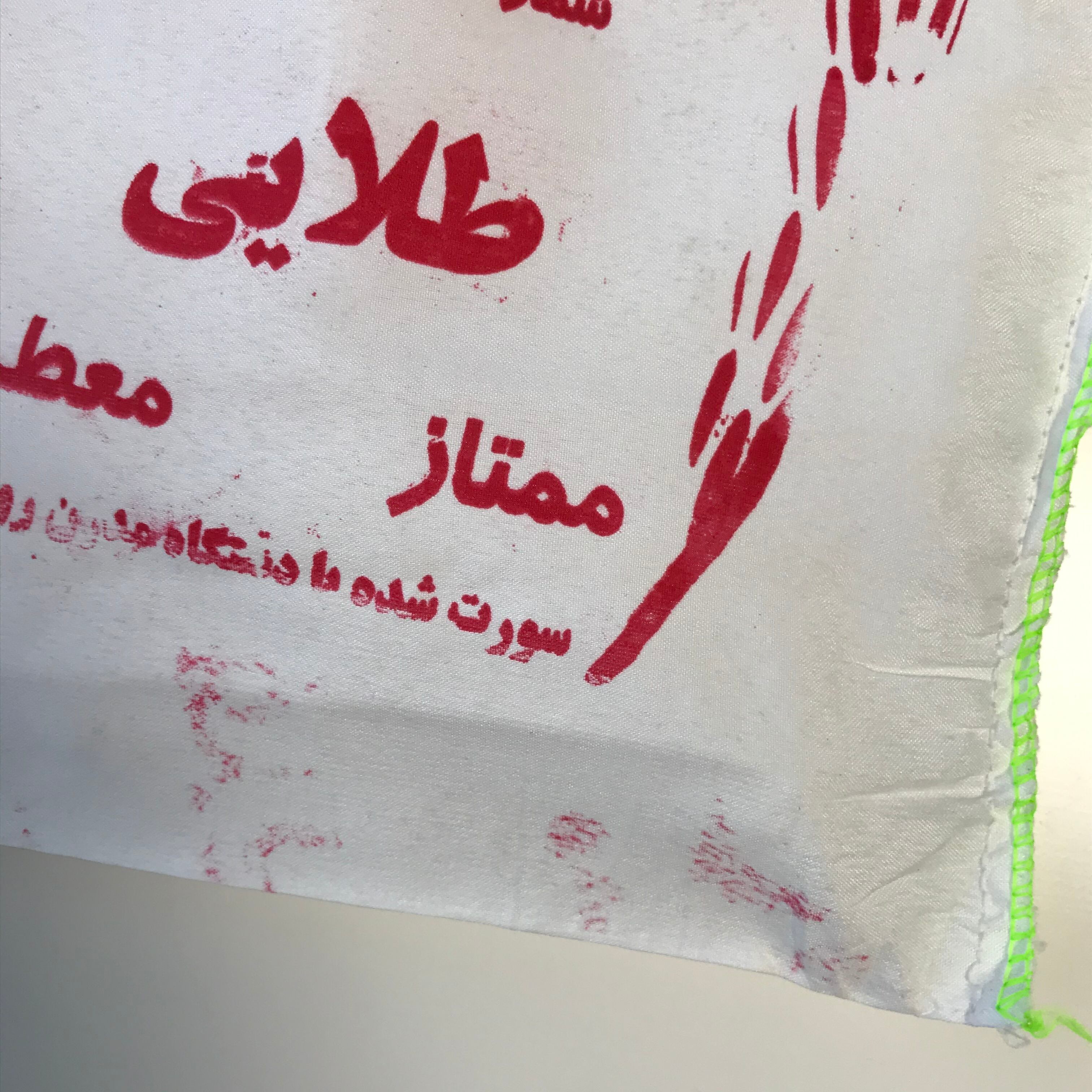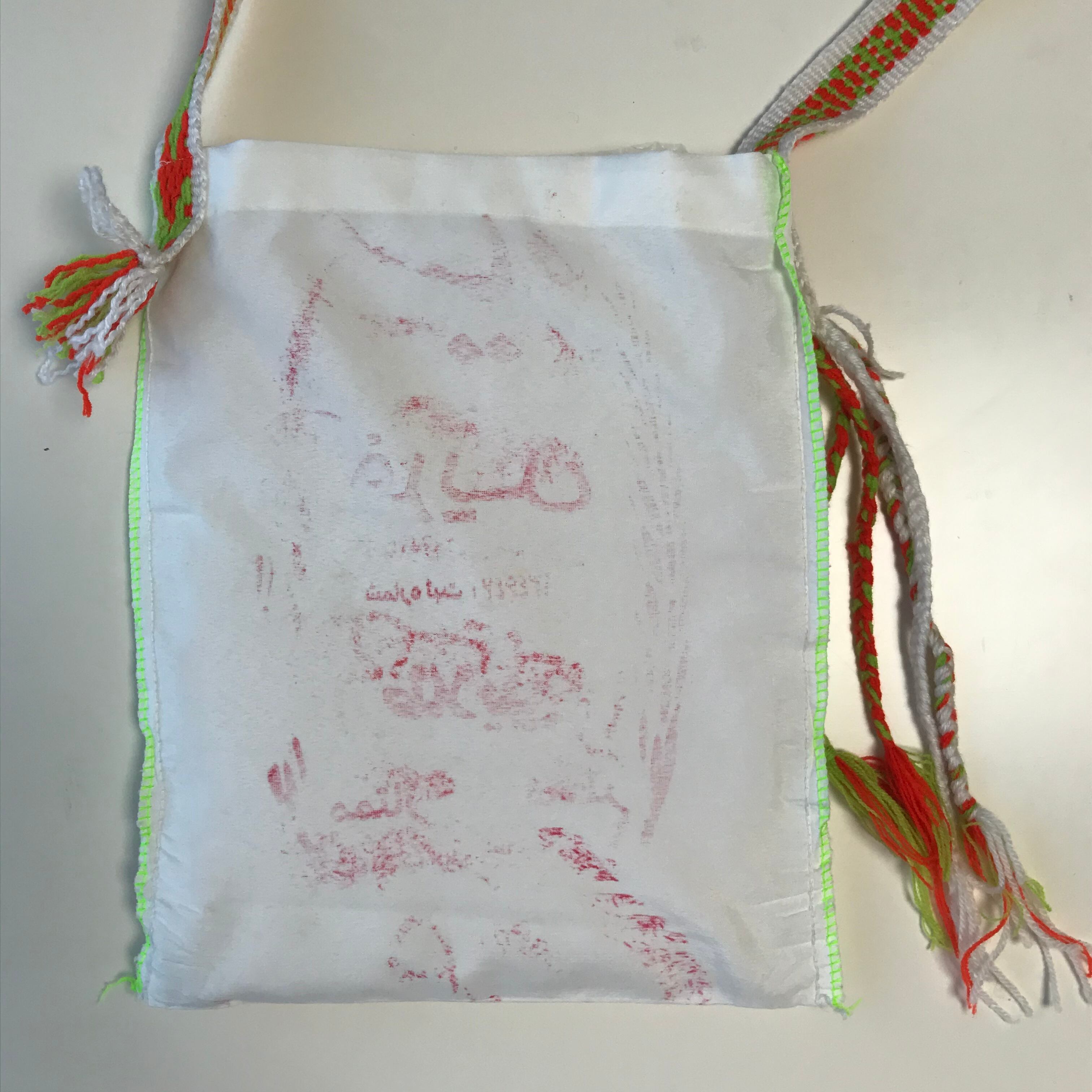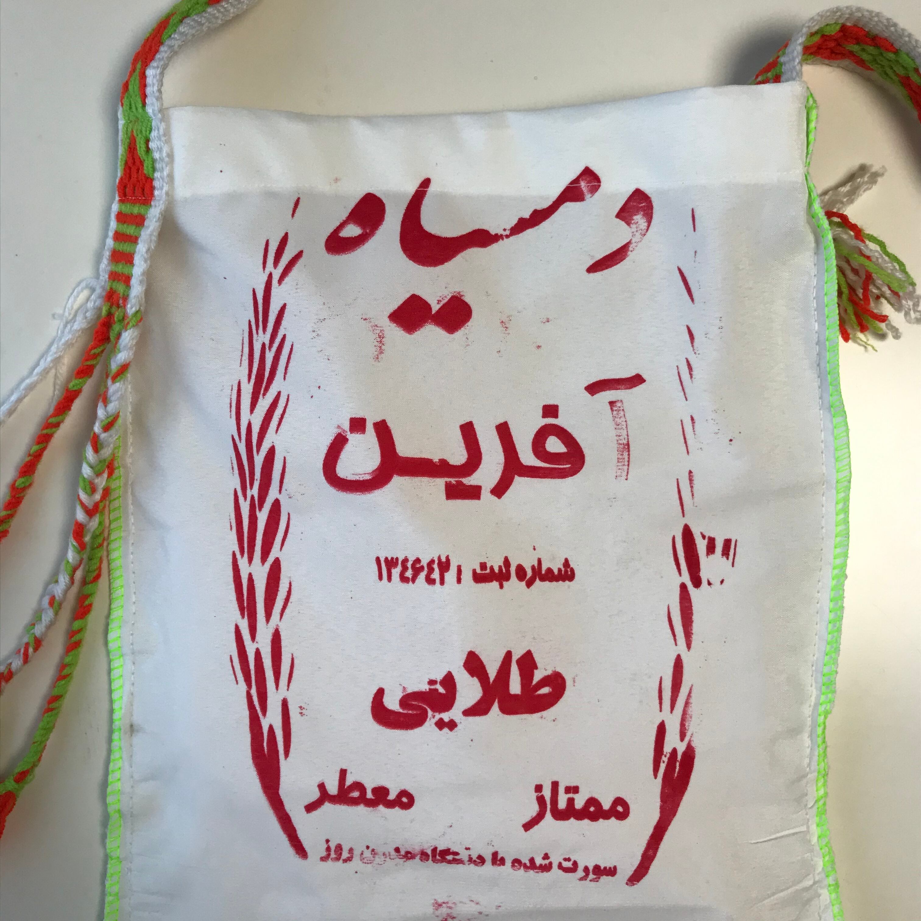 黄緑の縁取りは元々のものです。このセンスがイランの米袋です。