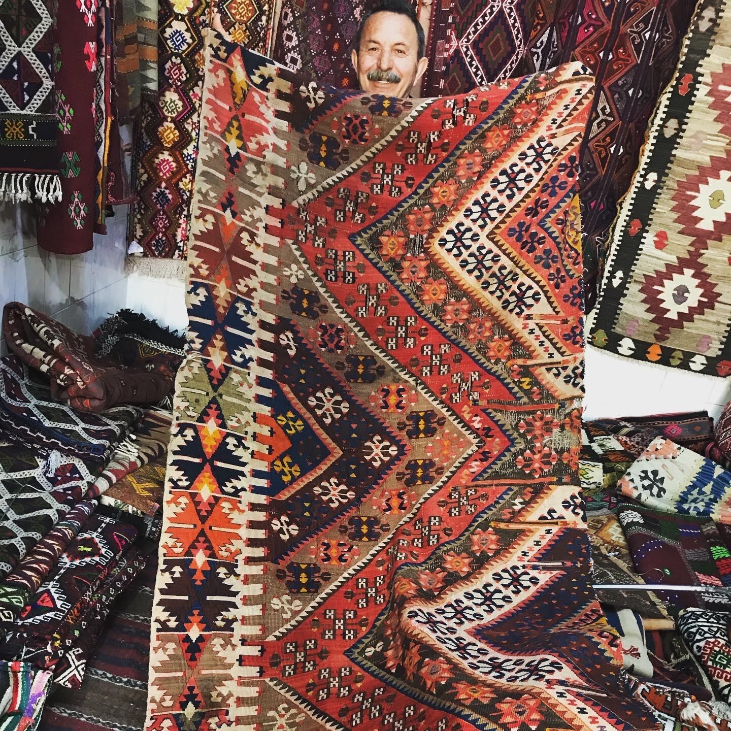 キリムを仕入れたお店のおじさんの話では、100年ほど前の、トルコの中部カイセリあたりのキリムとのことです。