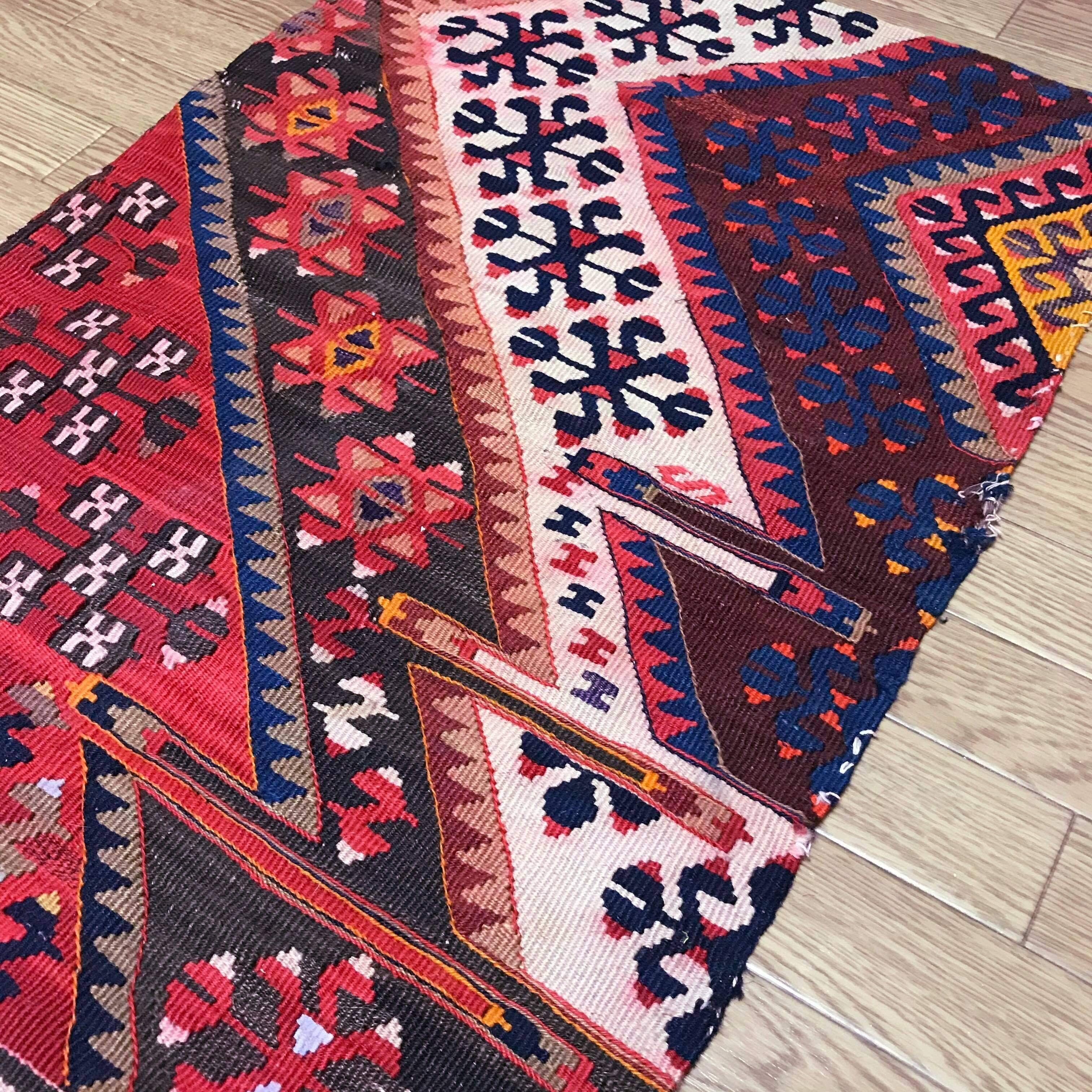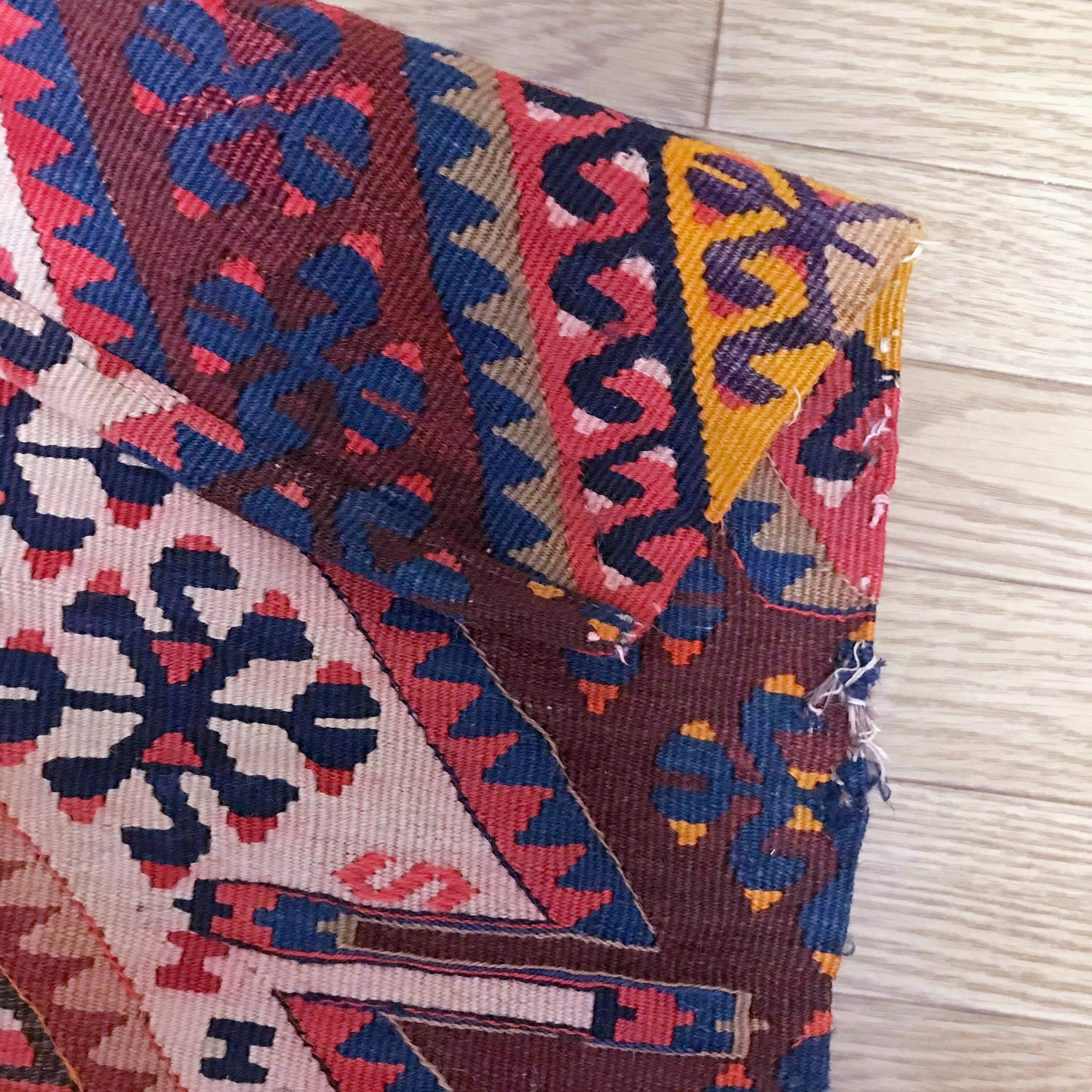 100年ほど前のキリムのため、痛みがある部分がかなりありましたが、そこを避け、使える部分を選んで作っています。