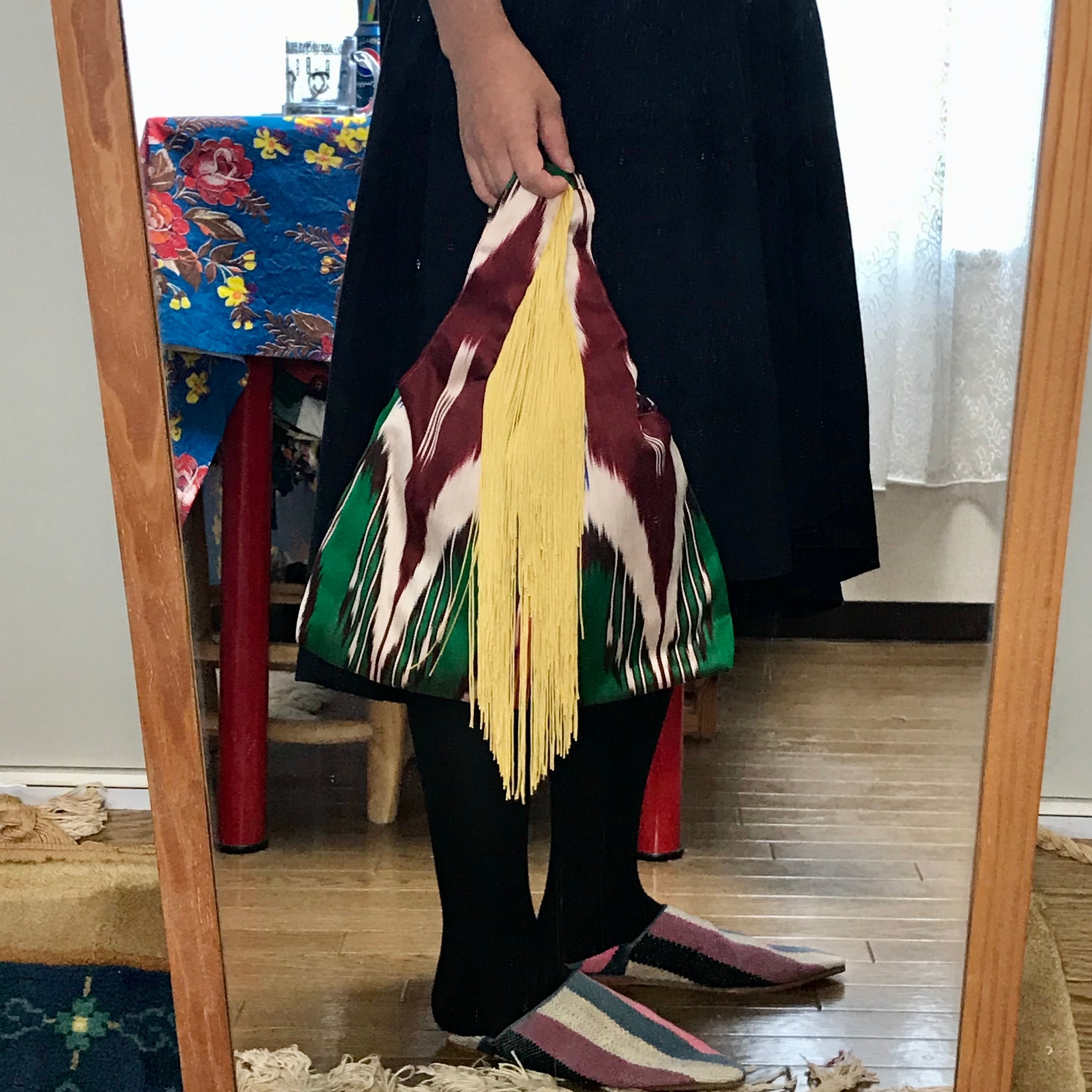 カシュガルで仕入れたシルクのアトラス生地とゴールドのシャラシャラを合わせたゴージャスなバッグです。
